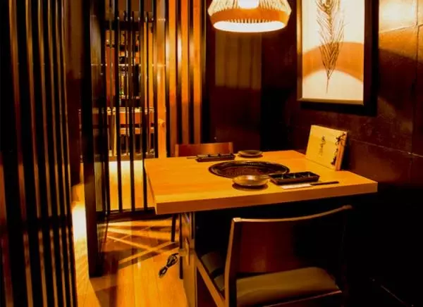 JR渋谷駅から徒歩5分の焼肉専門店【渋谷焼肉富士門】は、生食用食肉の規格基準「認定生食用食肉取扱者等設置施設」の取得店舗。新鮮な「和牛ユッケ」や「和牛刺し」などの生肉を安心して楽しめます。木と黒を基調としたシックな雰囲気の店内は、美しい日本画が随所に飾られ、和のテイストを添えてオシャレに演出。
