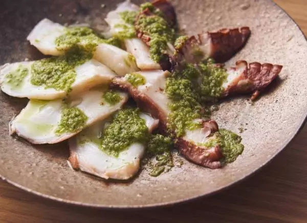 鮮烈な香りと軽やかな味わいがスターターにぴったり。『北海道産水タコ、青ネギ山椒ソース』770円