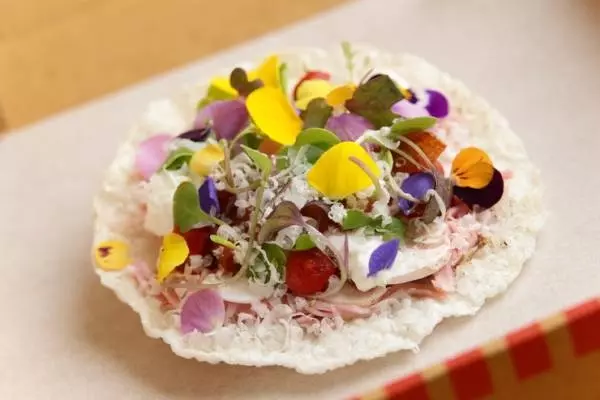 コース料理の一番手は『Pizza Delivery』。まるでゲストを迎える花束のような美しさがあります。まろやかな甘みと深いコクが特徴の新之助米とトウモロコシを粥状に煮た白ポレンタを合わせて揚げた生地に、モルタデッラやチーズ、エディブルフラワーなどで彩りを加えたピザです。