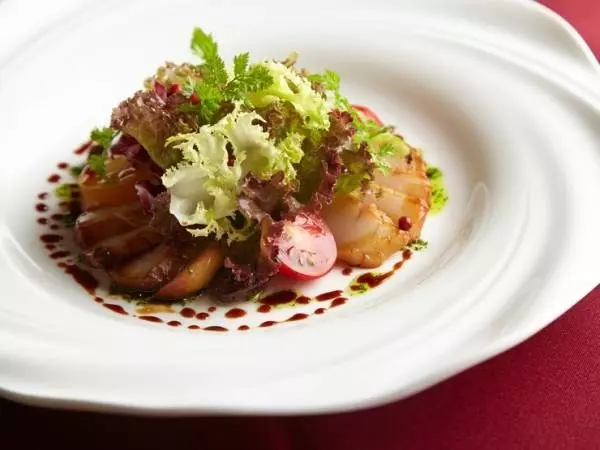 全国の新鮮な魚介類、京都上鳥羽の無農薬野菜、信州の天然キノコや山菜など、鮮度にこだわった食材でつくられる、繊細でやさしいイタリアンが魅力です。なかでも、最初の乾杯といっしょに味わいたいのが『ホタテ貝柱のスモークカルパッチョ仕立て』。ワインと楽しむ、新鮮な北海道産ホタテ貝の味は格別です。