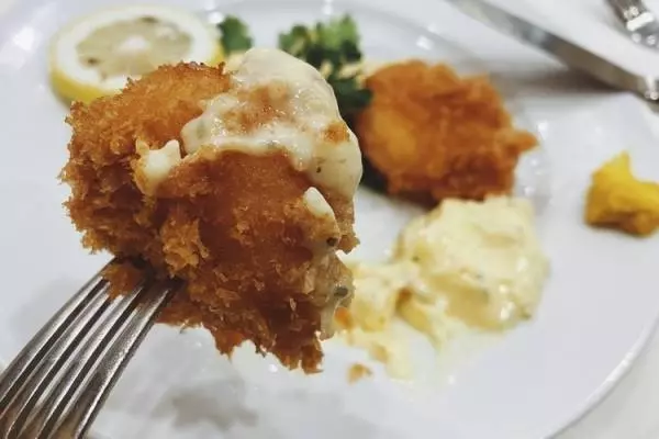 口のなかに広がる帆立のうまみ、そして酸味の効いたタルタルソース、衣の甘さ。三位一体となった幸せが押し寄せてきます。