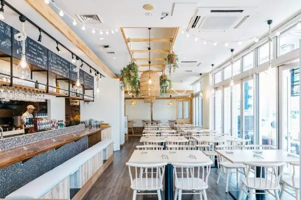 【biotable.】が構えるのは、田町駅から徒歩7分ほどの芝浦運河沿いです。店内は白を基調に、随所に木をあしらったナチュラルな雰囲気。フルオープンになる大きな窓から、明るい陽が差し込みます。