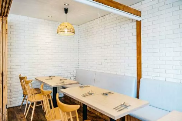 清潔感のある白い壁面に、ゆったりと座れるベンチシートを配した個室