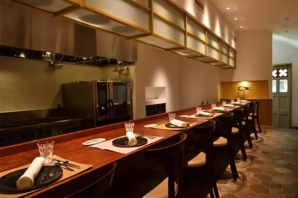 名店がひしめく東銀座。その路地裏に、注目のフランス料理店【LES FRERES AOKI(レフ アオキ )】が誕生しました。ロケーションは歌舞伎座裏手。ひっそりとした隠れ家のようなお店のアンティークの木製ドアを開けると、そこはオープンキッチンスタイルの、カウンター10席の空間が広がります。