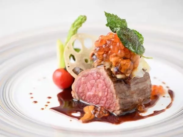 贅沢な味を堪能できる『鹿児島産黒毛和牛のステーキ(北海道ウニ、イクラ乗せ赤ワインとわさびのソース)』(コース料理より)