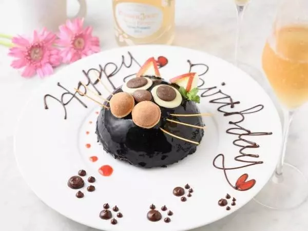 可愛らしい黒猫のケーキに歓声が上がる『黒猫特製ホールケーキ』(コース料理より)