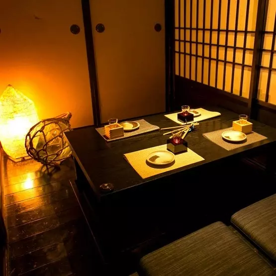 和の趣を感じるオシャレな個室、優しい照明で心が和み、会話も弾みます