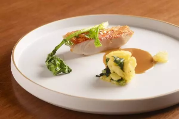 「八丈島は黒潮が入るのでマグロなどもおいしいですし、海が綺麗なので、金目鯛の味もクリアなんです。レモングラスと塩水で漬けて、水分を軽く飛ばして身を引き締めてから、オリーブオイルで皮目をパリッと焼き上げています」