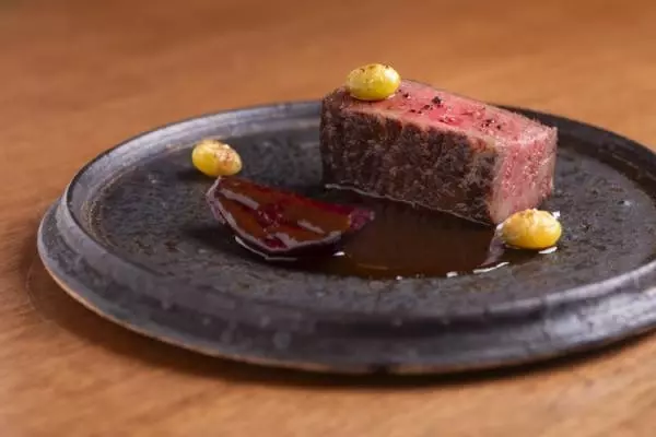 メインの『東京和牛とビーツ』は、しっかりとフレンチの粋を凝縮した赤ワインソースに、「青梅ファーム」のビーツと庭で穫れた銀杏を添えて。