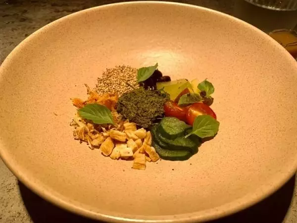 【AnDi】がオープンした当初から出しているという『ティーリーフサラダ』。真ん中には乳酸発酵した福岡県の八女茶(やめちゃ)の煎茶。中央上から時計回りに甘納豆、メロン、スモモ、トマト、キュウリ、焼きココナッツ、オニオンフライ、桜エビ、ゴマと並びます。ドレッシングは北海道のメロンとジャスミンティを加えているそうです。すべて混ぜていただくのですが、食感と味が重なり合っていて複雑に感じられながらも、計算されたおいしさに驚きます。甘い、しょっぱい、香ばしい。カリ、シャキ、ポリ。そんなすべてが楽しいのです。