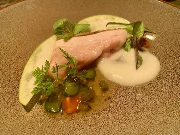 こちらはむっちりとした鶏肉の弾力と、皮目を炭火で焼いているその香ばしさに幸福度があがります。またソースが面白く、白いソースはジャスミンライスを貝のだしやハーブで炊いて伸ばしたもので、コクの強い甘みと芳醇な香りが唯一無二でした。透明のソースはシェフの自家製ハラペーニョを発酵させたソースで、辛味が気にならずに酸味と旨みが押し寄せます。とろっとしたテクスチャーもとても心地良く、アクセントの青りんごもいい仕事をしています。