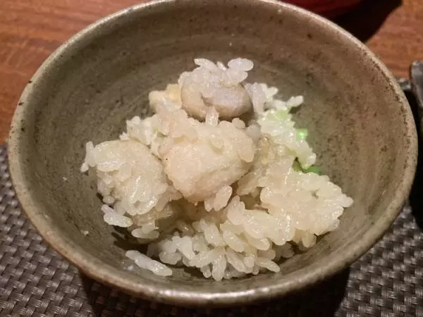 お茶碗に盛り付けられた『海老芋の土鍋ごはん』。やはり地味、だが圧倒的に美味しい