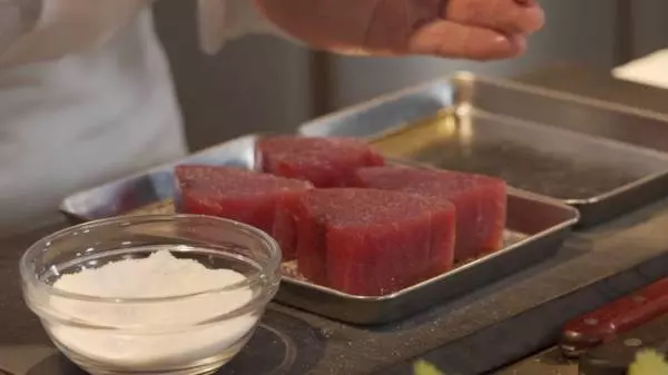 ①カツオは60g程度のサイズにカットして、表面にうっすらと軽く塩を振り、冷蔵庫に入れて15分寝かせます。