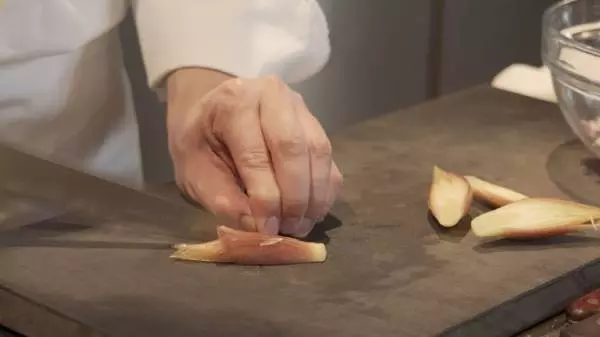 ②セビーチェ風ソースに使用する野菜(紫玉ねぎ、茗荷、ミニトマト、パクチー)はすべてお好みのサイズにカットします。
