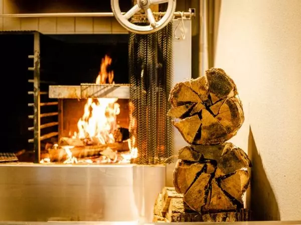 店内奥に設えられた薪焼きの炉窯。テーブル席からも、肉が焼かれていく様子などを見ることができる。薪には楢木を使用している。