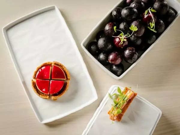 コースの最初に登場するアミューズ3種。本来は、一品づつ登場する手前から、『秋鮭のマリネパルメザン卵黄』、『フォアグラのムーストマトハイビスカス』、『巨峰のモザイクライチシトロン』。巨峰に似せているのは、ライチとレモンのクリームをカカオバターとカシスのジュレで覆ったもの。