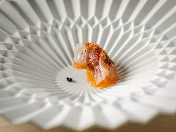 甲イカのピペラード。3日間熟成させたイカを薄くスライスし、トマトのタルタルとピーマンエスプレッドなどを巻き込んでいる。