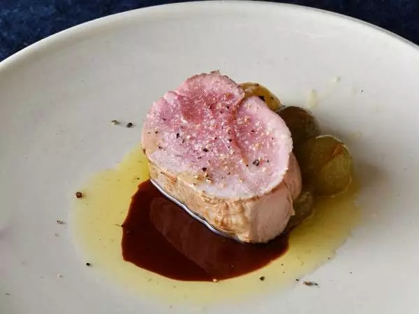 メインを飾るのは『岩中豚シンタマのロティ』。内もも下部にあたるシンタマは脂肪が少ない赤身です。硬めの仕上がりかと思いきや、柔らかくてジューシーに。フライパンで軽く焼き色を付けたのち、オーブンで加熱していますが、シェフの絶妙な火入れのおかげで程よい噛み応えと柔らかさを実現。