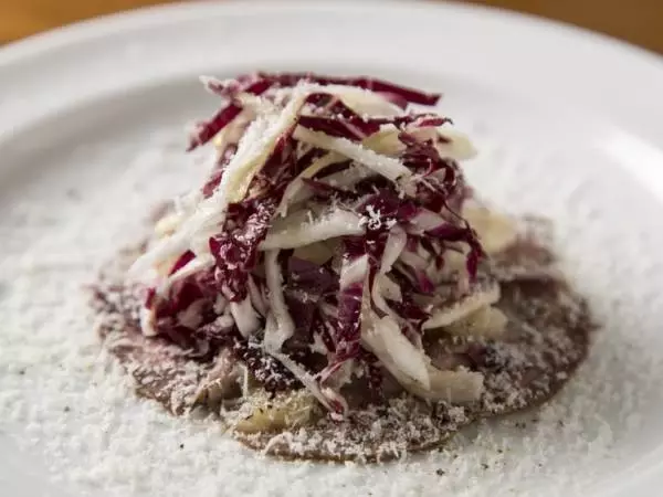 肉料理に甘いジャムを合わせるピエモンテ州の伝統料理をベースにアレンジしたオリジナルのひと皿。さっと火を入れた馬肉に桃ジャムを添え、やや苦みのあるトレビスを加えてサラダ仕立てに仕上げられています。コクと香りをプラスするペコリーノチーズが、さりげなく美味をあと押しする名脇役に。