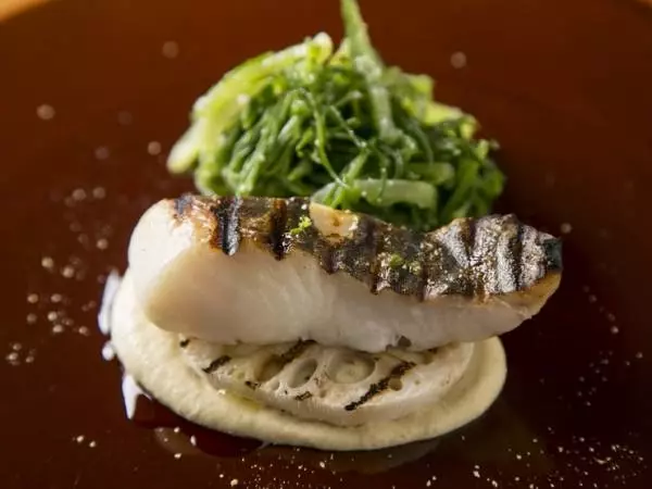 一晩マリネしたマナガツオをしっとりと焼き上げ、おかひじきやゴーヤなど苦味のある野菜や新レンコンを添えたひと品。