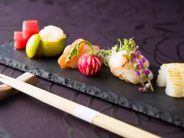 「料理には驚きと楽しみが必須」と語る店主。ほかのお店にはないようなアイデアでゲストを喜ばせています。芸術品のような『お造り』につけるのは、醤油あんとシャリの入ったあんとを組み合わせたソース。一風変わったソースのおかげで寿司のような風味を楽しめます。