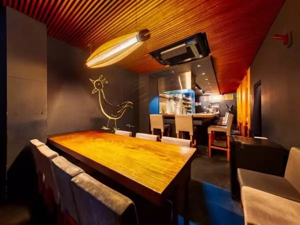 壁に大きく描かれたにわとりが目を引く店内は、落ち着いたオシャレな雰囲気で、大人の時間をゆっくり楽しむのにピッタリ。カウンター席では、調理のライブ感を楽しみながら、食事ができるのが魅力。半個室や大テーブルもあり、少人数のデートや接待から、大人数の宴会まで、幅広い用途で使えるお店です。