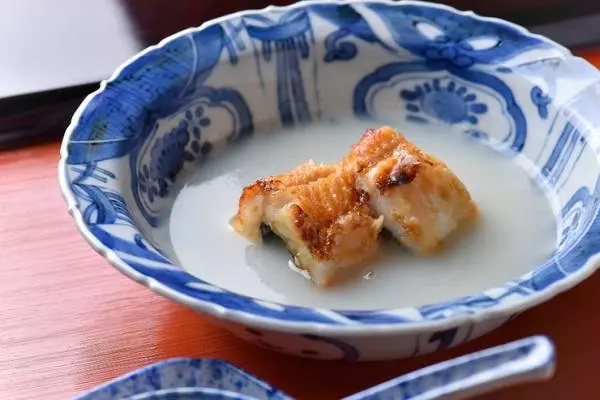『焼き穴子と百合根のすり流し』は標津町の百合根と噴火湾の真穴子を使用した料理です。旨みが強い血合い入りの鰹だしで伸ばした百合根のすり流しは、まろやかな甘みを堪能できます。薄く醤油を塗って焼いた真穴子を崩せば、すり流しと融合を果たし、複雑で奥深い味わいに。