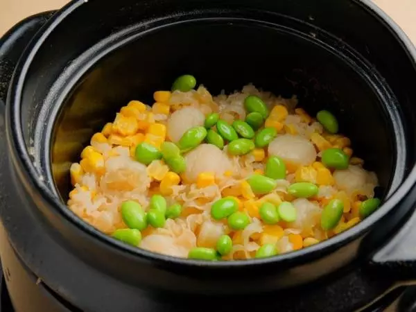 枝豆やトウモロコシなど季節の食材を炊き込んだ『季節の土鍋ごはん』(コース料理より)