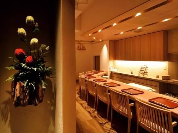 店内は、大人が落ち着いて過ごせる、ゆったりとした雰囲気。座席は、アフリカンチェリーを使った一枚板のカウンター席のみです。調理風景を眺めながら、料理人との会話を楽しめるのもうれしいポイント。デートや接待など、大切な人とゆっくりくつろぎながら、おいしい料理や会話を楽しめるお店です。