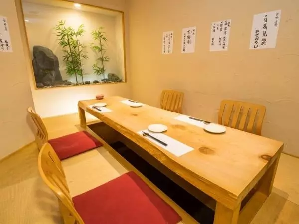 隠れ家的な店内は、従来の割烹店の堅苦しさが取り払われ、くつろいで食事ができるように配慮されています。特に、掘りごたつ式の個室は、リラックスしてくつろげるプライベート空間。接待など大切な人をもてなす席にピッタリです。旬の料理や銘酒を楽しみながら素敵なひとときを過ごしてみてはいかがでしょうか。