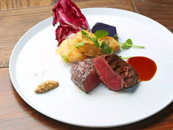 地元群馬の赤城牛の中でも、赤身の肉の旨みをダイレクトに味わえるランプ肉のステーキ。ミディアムレアで丁寧に焼き上げます。塩でシンプルに楽しむもよし、ソースで味の引き立ちを感じるもよし。メインにふさわしい一皿です。