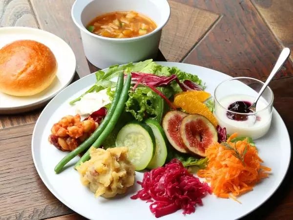 地元産の野菜をふんだんに使った、ヘルシーなメニュー。ボリュームもあるので、ブランチや午後の軽い食事にもピッタリです。フルーツや自家製デリカテッセンなど、種類が豊富で彩りの美しさもポイント。