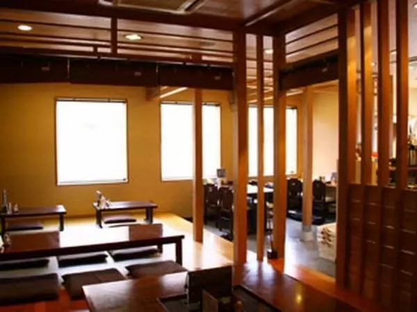 お店は、通りに面した和風の建物で、竹の看板が目印です。駐車スペースがあり、第2駐車場も完備されているので、家族で車で出かけるときもとても便利。広々とした店内は、和風の落ち着いた雰囲気。掘りごたつの席は、すだれの仕切りで半個室にもなるので、まわりを気にせず、ゆっくりくつろいで食事が楽しめます。