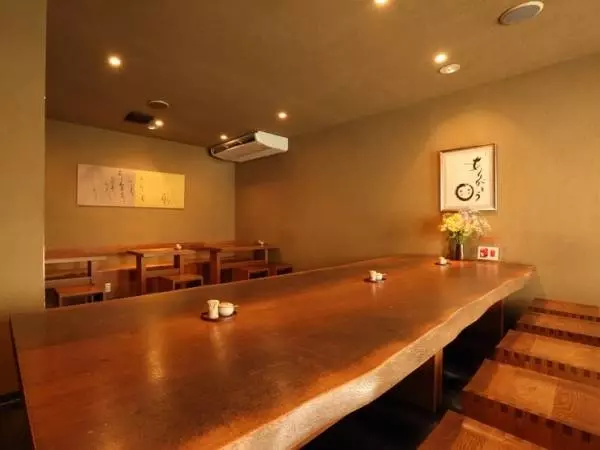 店内に足を踏み入れると、洗練された和の空間が広がります。カウンターやイスの木材には、楢の木が1本丸ごと使用されていて、落ち着いた雰囲気の中で、木のぬくもりを感じながらくつろげます。日当たりのよい大きなテーブル席は、大人数でも食事ができるのでファミリーに人気。親子3代で食事を楽しむ様子もよく見られます。
