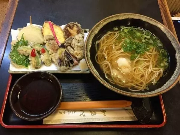デートや旅行者に人気の南京町。その入口付近にある【田舎そばみゆき】は、日本蕎麦を筆頭に、100を超える豊富なメニューがある名店。数あるメニューの中で、秋の味覚を味わえるのが『秋野菜の天ざる・天ぷらそば』です。