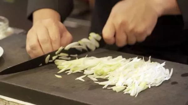 準備:モロヘイヤは葉だけにして、30秒ほど湯掻いたら氷水にさらし、包丁で細かくカットしておく。なめこはざるにあけてお湯をかけておく。エノキタケはみじん切りにする。①長ネギは縦ふたつに切ったあと、千切りより少し太めにカットします。