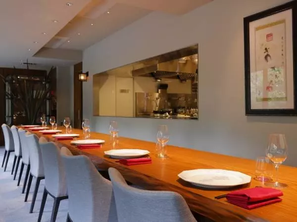 アフリカンチークの一枚板も見事なカウンターは、席と席の間隔もゆったりとした贅沢な設え。厨房との間に空間があり、ここで有島料理長が出来立ての料理をすぐさまサーブする。
