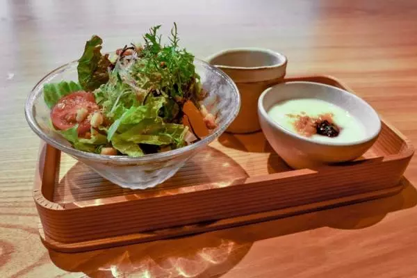 こちらの『地野菜のサラダ』も無農薬でつくられたもの。「小田原は相模湾に面していながらも野菜が強い」と松本さんは言います。それぞれ農法が違うことで味わいも少しずつ異なるそう。今回はからし菜、赤水菜、レタス、サニーレタス、キュウリ、ミニトマト、紫大根を自家製の昆布ドレッシングでいただきましたが、それぞれの野菜の味が濃厚で、畑がそのまま食卓にやってきたような感覚にさせられます。