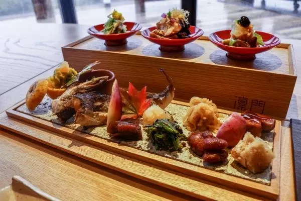 「実はこの下にも…」と現れた新たなお料理。素敵な演出に思わず歓声を上げてしまいます。『かぼちゃの煮物』はかぼちゃの煮物をすりつぶしてカスタードクリームや豆乳と合わせていて、ヴィーガンの方でもおいしく食べられる一品。地元の柑橘が器になっているのも粋です。ほかにも柚子胡椒で楽しむ『自家製の塩辛』や、頭まで食べられる『ヤマトカマスの炭火焼き』など、五感で楽しめるお料理がたくさん並びます。【凛門】さんのお料理はすべて自家製で、松本さんの強い想いが感じられます。