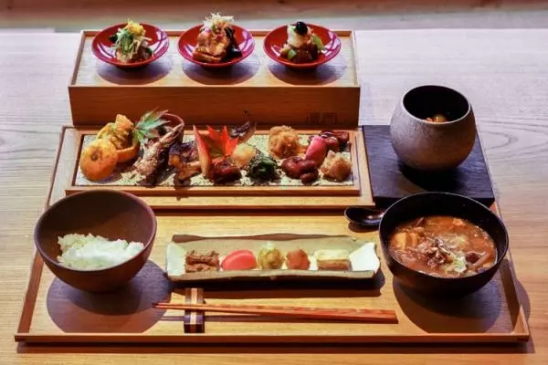3つの器が乗った土台を持ち上げると……お料理が隠れていました