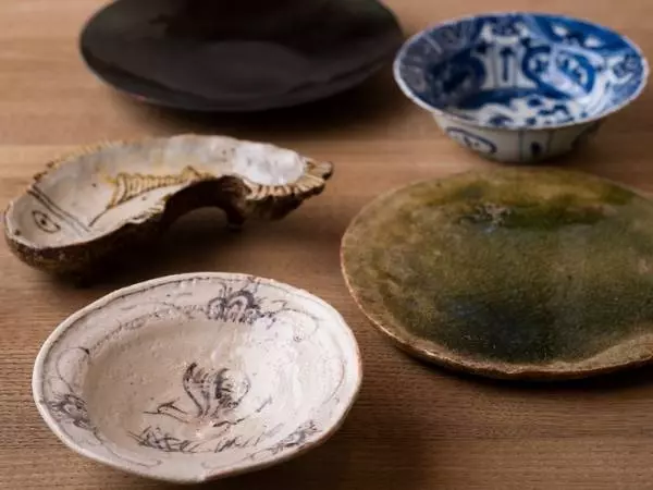 【石かわ】の料理を引き立てる器は、店主の石川さんがギャラリーに足を運んでセレクト。フランス製のアンティーク、大正時代のガラス皿、古染付、現代作家の作品など、さまざまなテイストを揃えます。