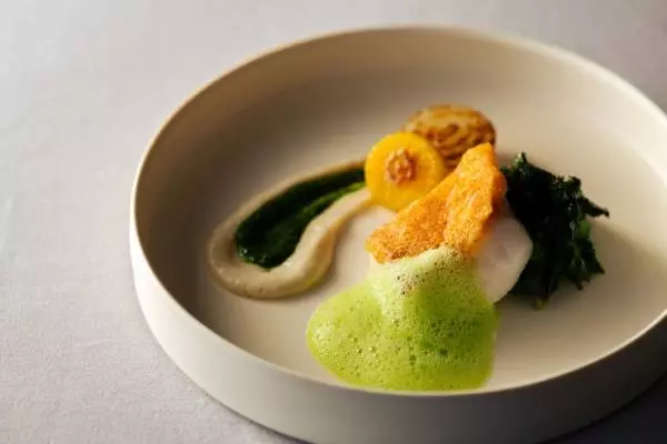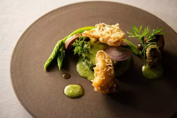 カリカリのべニエ生地を纏ったサザエは、旨みが凝縮された食感が楽しい。エスカルゴバターでソテーした甘み溢れるズッキーニや、鮮やかな色合いのアスパラソバージュを添えることで旬を表現しています。