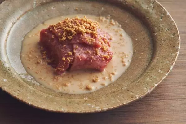 けれど、この温度がしつこくなく、さっぱりといただけるポイントなのでしょう。ほんのり甘味を抱いた冷たい蕪を、これまた甘い脂をほどよく含む薄切りの牛肉が包んで、香り高い胡麻とお出汁を合わせていただけば、コースの中盤でもほどよくお腹におさまります。