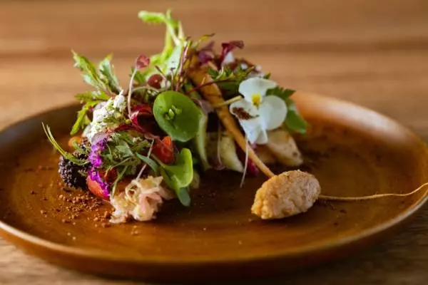能登の四季を料理に反映させるのが平田シェフのスタイル。なかでも『畑』と題された一皿は、40~50種もの旬の野菜を、それぞれの個性を引き出す調理をした上で盛り付けるスペシャリテ。蒸す、焼くといった手法のほか、発酵などの郷土料理のアイデアも取り入れつつ、バラエティに富んだ味に仕上げます。季節の畑の様子をそのまま切り取ったようなスペシャリテ『畑』