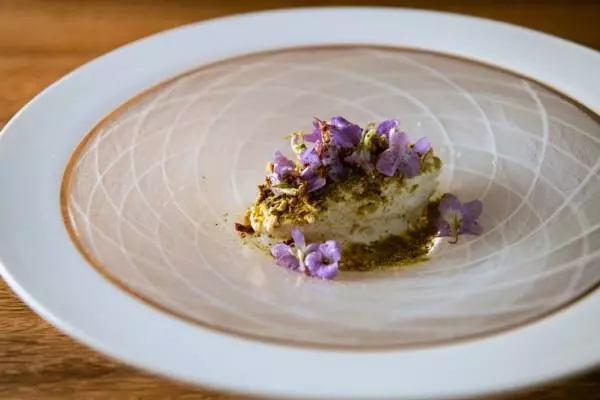地元産ミルクにふきのとうの香りを移し、自家製ヨーグルトや3年熟成味噌のメレンゲと合わせた初夏の料理。