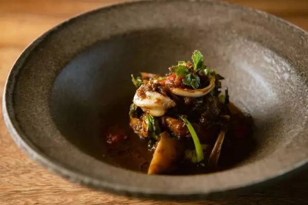 トスカーナのズッパディペッシェ(魚のスープ)を能登の魚介で再構築。オコゼ、アワビ、ヤリイカなどを、カニとオコゼのだしや香味野菜とともに煮込んだ逸品。