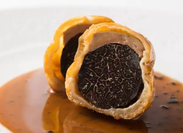 シェフのヴォワザン氏が師事したフランスの三つ星シェフ、ジェラール・ボワイエ氏直伝の贅沢な一品。フォアグラを塗ったトリュフを丸ごとパイで包み、軽く焼き上げています。黒トリュフをたっぷり加えたソースペリグーとともにいただくと、さらに幸せな気分になれるでしょう。ぜひ、アラカルトでご注文を。