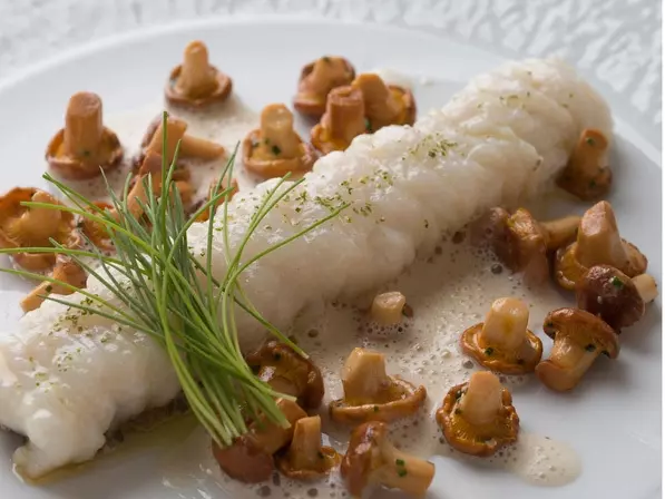 フランス料理のクラシックな組み合わせ“魚ときのこ”を、日本ならではの食材・ハモで表現した一皿。ハモは日本料理同様に骨切りし、皮目から焼いてふっくらと仕上げています。ハモときのこのだしをベースに、すだちの果汁を加えたほどよい酸味のソースとのハーモニーも絶妙です。(※季節により提供のない時期があります)