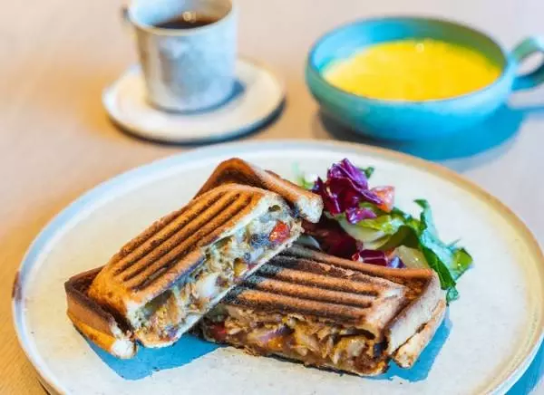 【sio】のイズムである、「5味+1」(=甘味、酸味、旨味、塩味、苦味+辛味、食感、香り)が味わえるホットサンドです。