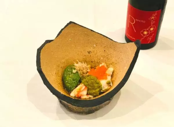 香りが立ちすぎず、それでいてふくよさかのあるお酒を合わせたいと思ったときに真っ先に「鄙願 大吟醸」が思い浮かびました。味に丸みがありながらほどよく酸がのっていて、お酒単体で飲んでもしみじみと美味しい。ずっと飲んでいたいと思う心地よさがあります。鮮度のよい花咲ガニは身がシャキシャキと小気味がよく、咀嚼するたびに口の中に柔らかい旨みが広がるのですが、出汁と蟹の旨みにやさしく寄り添ってくれるようなお酒だと思います」(加藤さん)